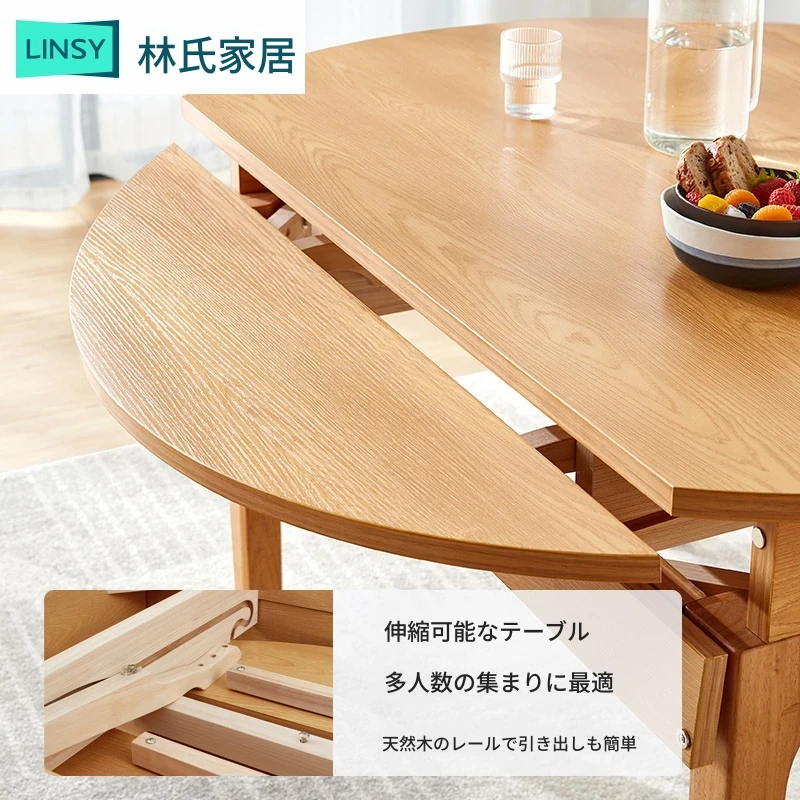 リン氏家居のナチュラルウッド調ダイニングテーブルセット - ストレッチ&折りたたみ式、円形にも変身!高品質な無垢材の脚で、スタイリッシュで機能的な空間を演出します。リン氏木業 LS068