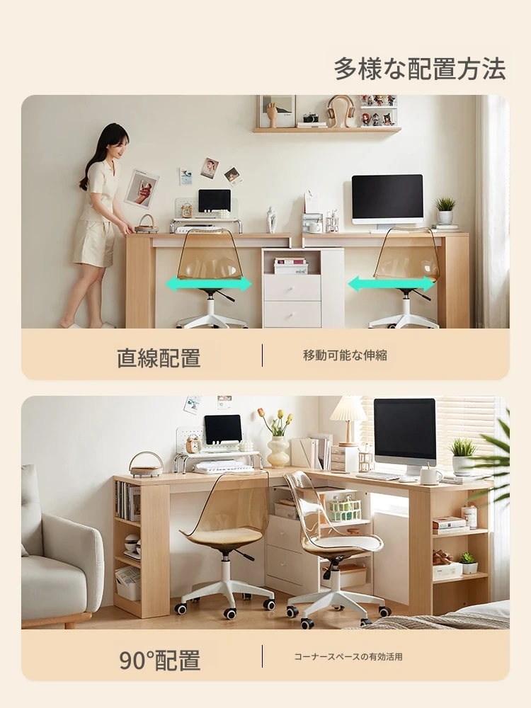 リンシー家具 フレンチクリーム風 書斎デスク&キャビネット一体型 家庭用伸縮式コーナーデスク 林氏木業 TE1E - スタイリッシュで機能的、あなたの作業空間を優雅に演出します!