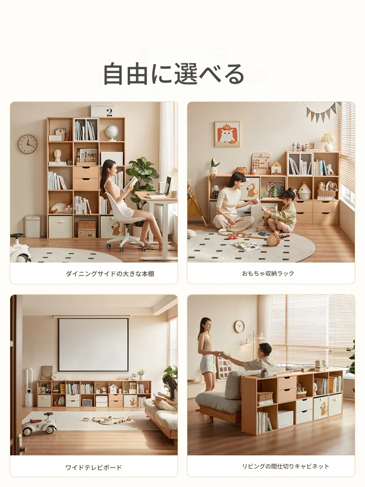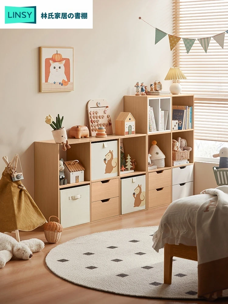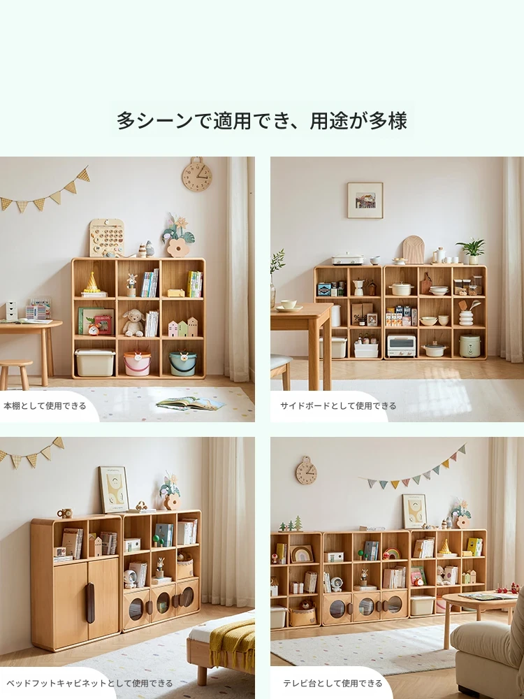 リンスホームのリビングルーム用ブナ材無垢自由格子収納キャビネット - お子様のための書斎ラック、おしゃれで機能的!整理整頓も簡単、スタイリッシュなお部屋づくりをサポートします。