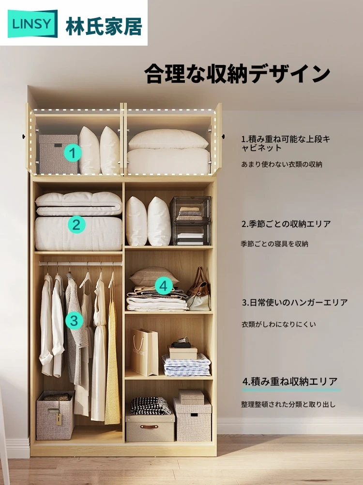 リンシー家具のプッシュ&プルドア付きクローゼット|主寝室に最適な新しいデザイン|狭いスペースでも効果的に収納できる!|リンシーウッドメイド