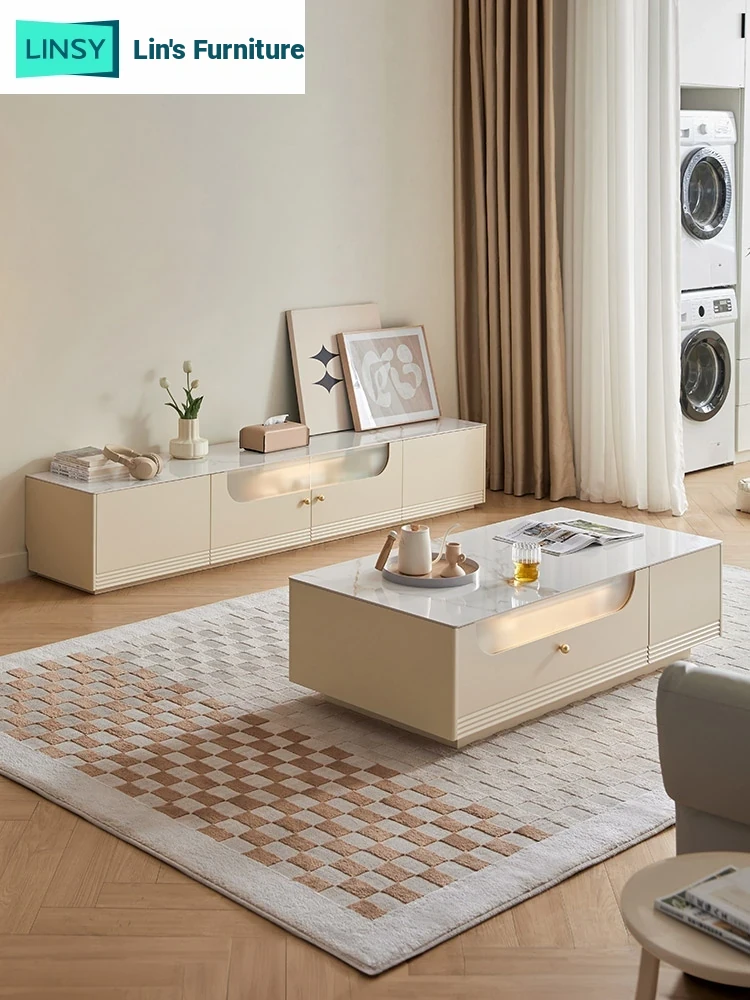 Linsy Home Modern Creamstone TV Stand and Coffee Table Set – Elegant Minimalist Living Room Furniture for a Luxurious Touch, Perfect for Any Home (QY1M)