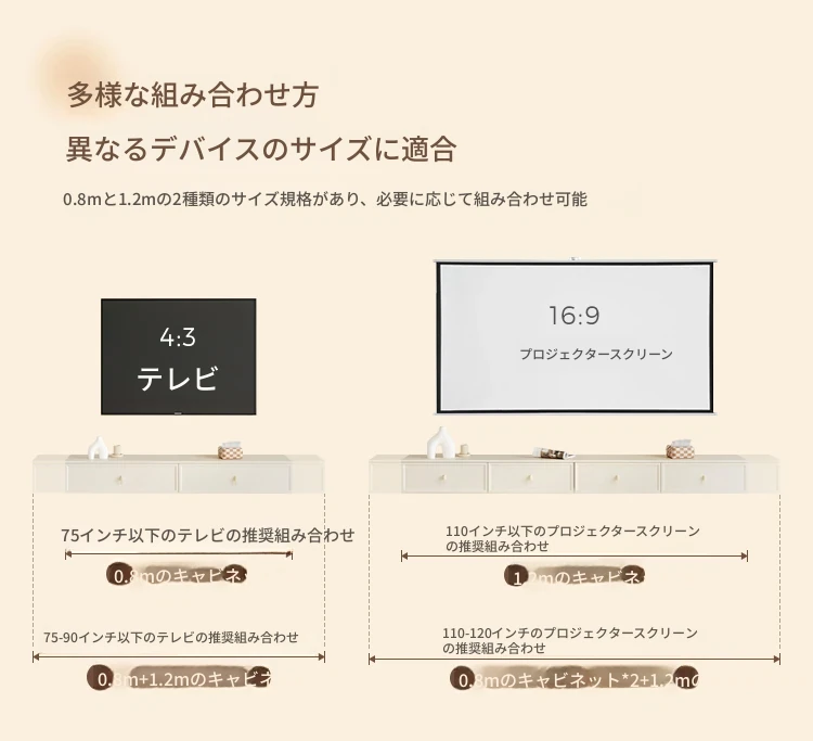 2.0メートルテレビキャビネット+0.8メートル収納キャビネット+0.4メートル収納キャビネット+吊り棚