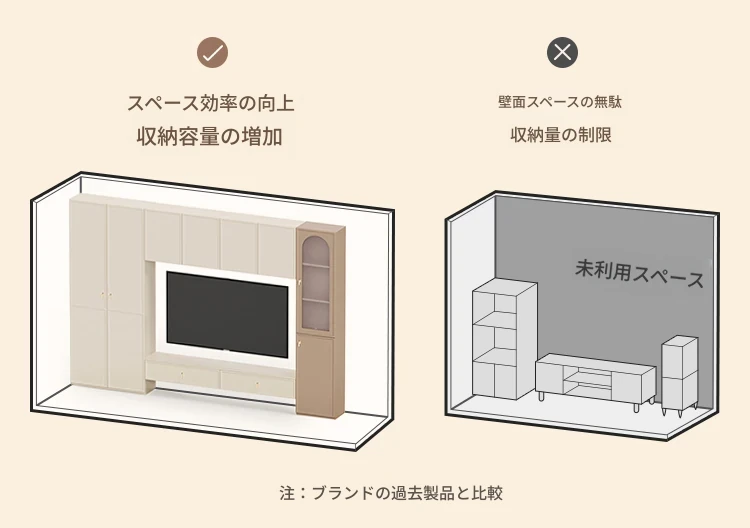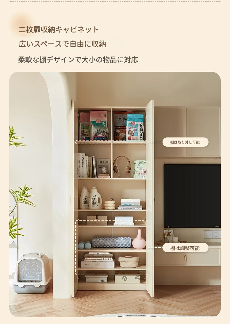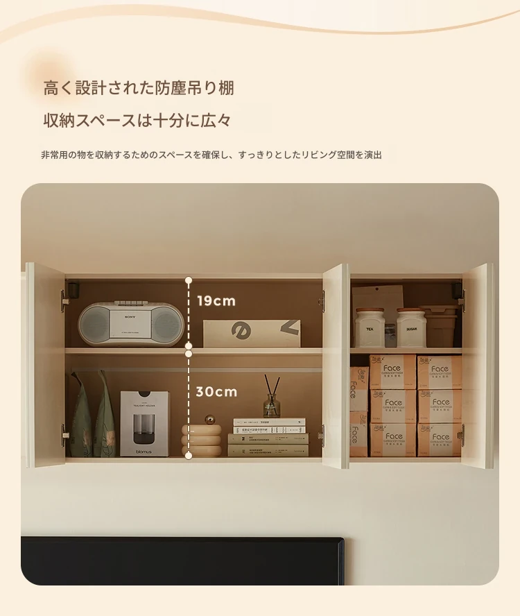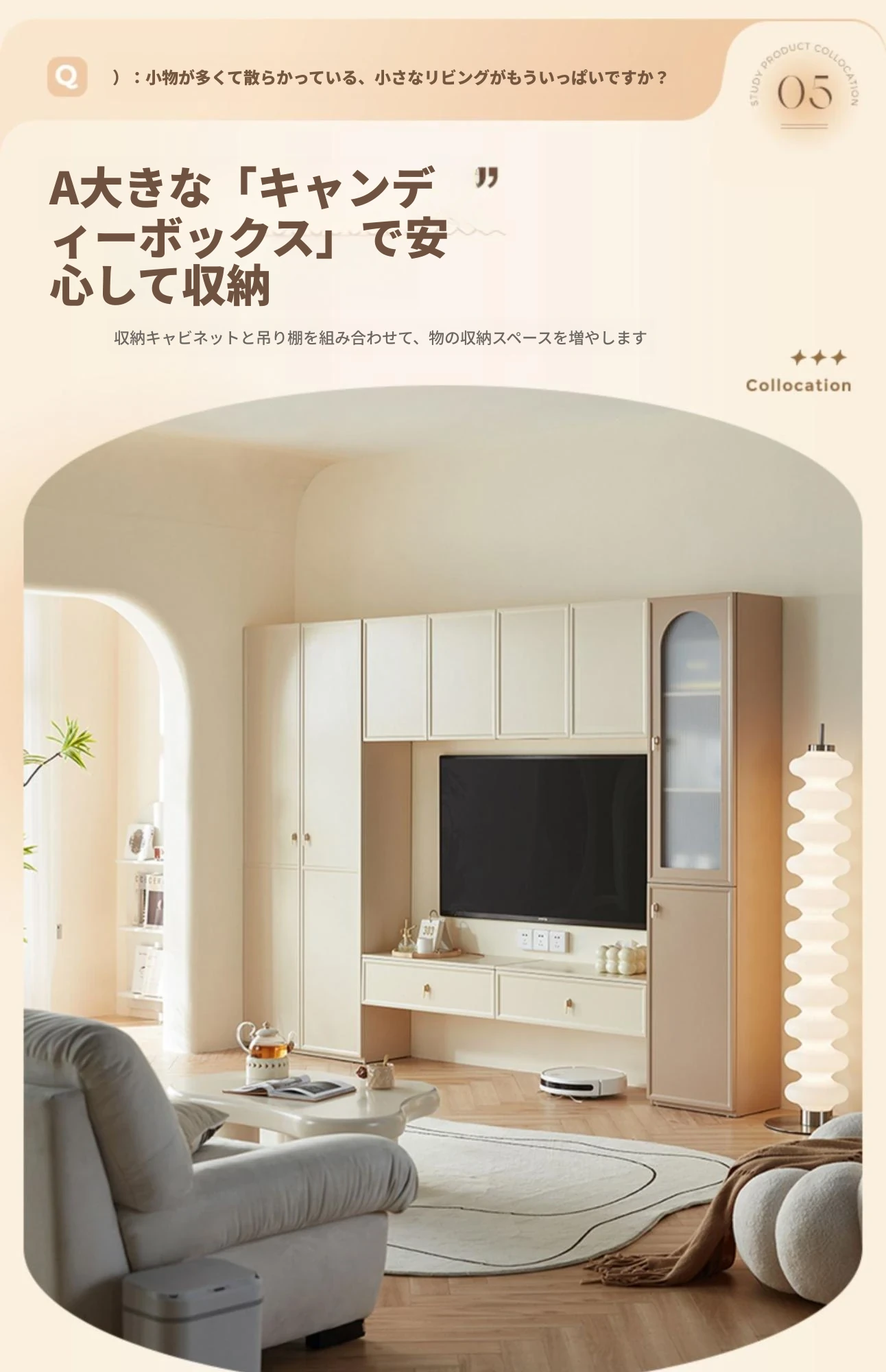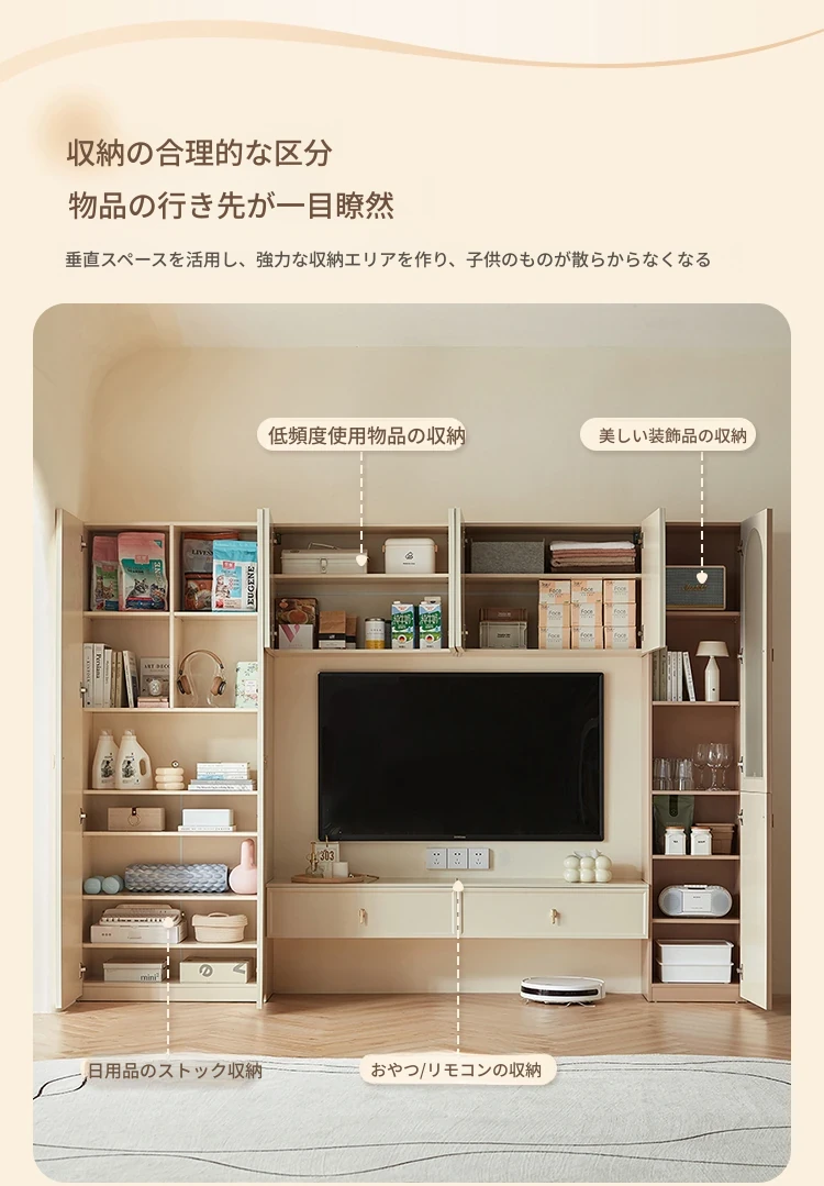 2.0メートルテレビキャビネット+0.8メートル収納キャビネット+0.4メートル収納キャビネット+吊り棚+トップキャビネット